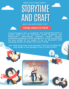Join us for this heartwarming story full of fun! After the adventure, you’ll get to make a fun penguin toy to take home!🎨